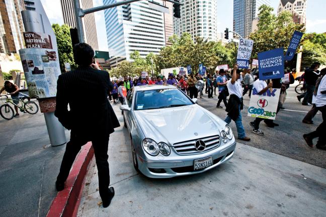“No stopping! No talking! Just buying! Everything’s fine!” I shouted as people passed on the crowded sidewalks of 5th and Spring. My two friends and I posted up near a KCAL reporter on the corner and unfurled our “Class WARhol” banner, while another held a sign that read “Legalize Art.”