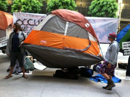 Following the general assembly, about seventy occupiers took to the streets to march to the ongoing occupation of the Central City Association. We had a lot more people than the previous night, and the energy felt euphoric and tactile, much like the tribes around City Hall in last year. Young and old helping set up tents, an artist painting on canvas, and cardboard codes of conduct taped to trees. Pots, pans, guitars, boom boxes, and voices… all doing their part in clanging, strumming, thumping, and singing about solidarity and the revolution. Check out the photos here by Erik Herrera.