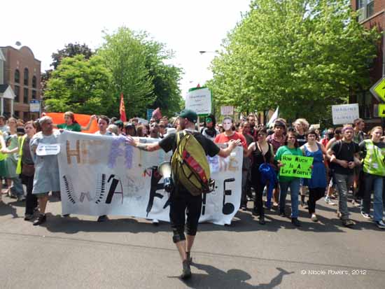 As our procession made its way through the park, and then the streets of the upper-middle class neighborhood, the rotating chants du jour included, “Fight, fight, fight. Healthcare is a human right”, “Healthcare is under attack. What do we do? Stand up, fight back,” and “Healthcare not warfare,” echoing the sentiments of yesterday’s NNU’s Robin Hood Tax rally, which called for a minuscule tax on trades to pay for, among other things, true universal healthcare. It was indicative of our government’s current priorities, that they spent tax dollars on helicopters to police a march for something that more civilized countries already consider to be a fundamental human right.