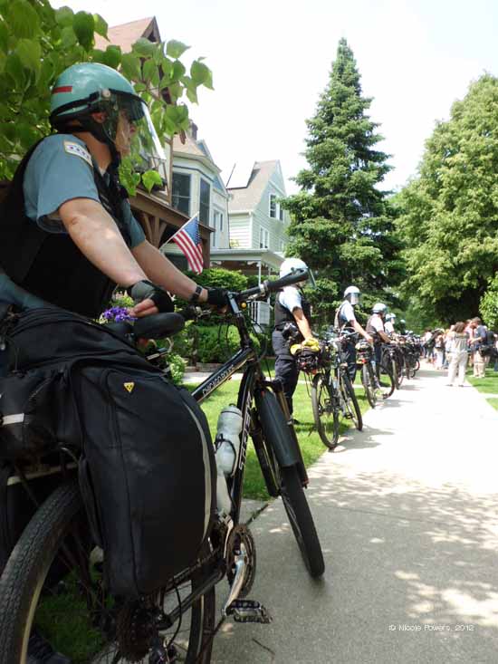There was a large police presence when we arrived a Mayor Emanuel’s home. Most were wearing riot helmets, and were armed with plastic zip ties, batons, and bikes – the latter serving as mobile barricades which physically barred us from stepping on the mayor’s front lawn. Not that we would have. The protesters were very respectful of the fact that it was a residential neighborhood. The chanting had mostly ceased, and the human mic was functioning at a suitably low volume.