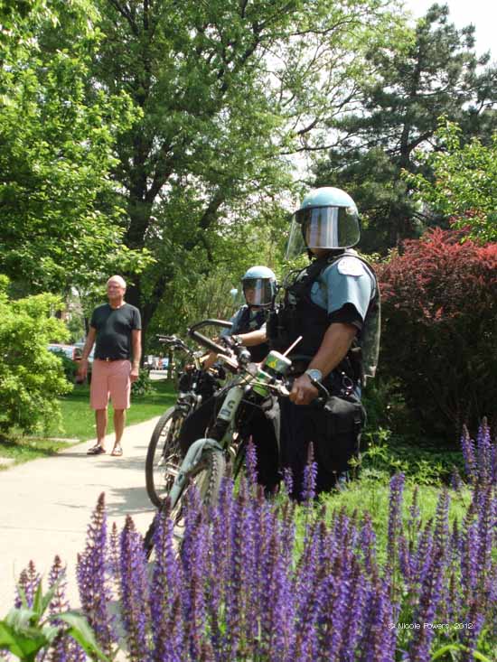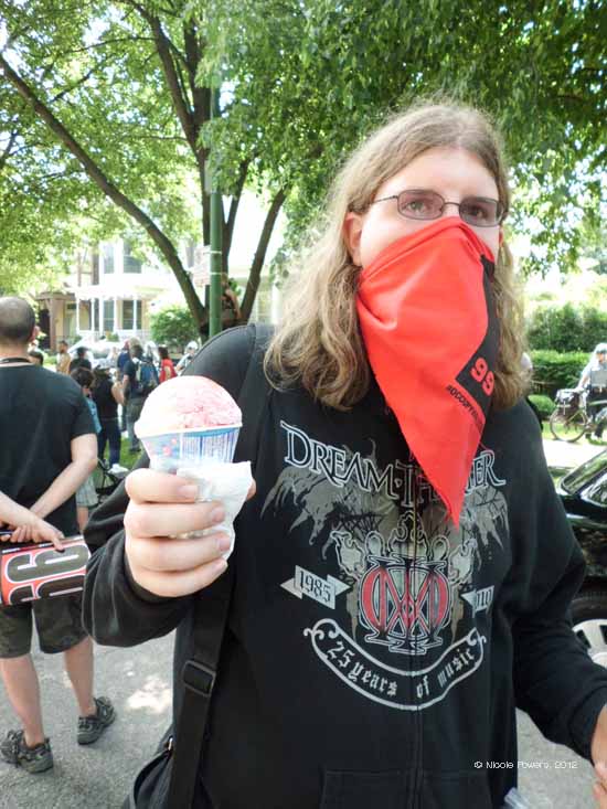 Vendors were serving refreshing frozen treats from carts. Despite their clear capitalist exploitation of our political gathering, many protesters, including this one, were more then happy to indulge in their wares. Indeed, the scene was more than a little comical, as battalions of riot cops stood amidst flowering shrubbery, policing protesters who were milling around eating ice cream.