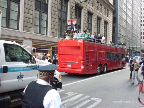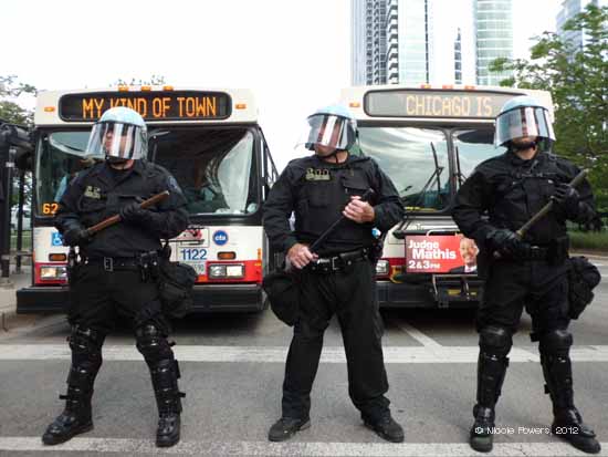 Following a speech by Jesse Jackson, Chris Geovanis of Chicago Indymedia briefed members of the media under the shade of a press not-quite-tent. She told us that when the police conducted the search that had lead to the NATO 3’s arrest it had taken them four hours to produce a warrant which was unsigned when it finally arrived. “That is the hallmark of dirty policing in this town,” said Giovanis, “There may very well be police entrapment here.”