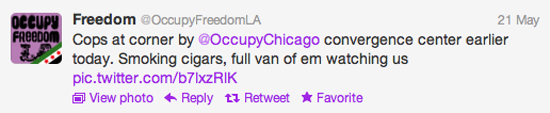 One of the best things about this whole Chicago odyssey had been the opportunity to meet friends in real life whom I’d previously been conversing with exclusively online. This phenomenon seemed to be universal among the protesters that had gathered in the city. Consequently, over the past few days, at marches, rallies, and at the Occupy Chicago Convergence Center, Twitter handles seemed to be more ubiquitous than names.
