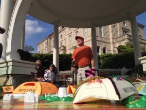 HARRISONBURG, VA - Fifteen Harrisonburg, VA OccuPeeps gathered next to our brand new tiny tent encampment at 5PM for a singing “hootenanny” with four guitars and a collection of percussion.