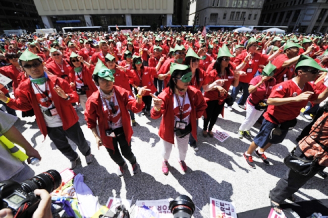 The Nurse’s Union Rally was pleasant. We aimlessly mingled with lots of friends from New York who stuck out from all of the nurses dressed in identical red t-shirts with red-feathered, green Robin Hood caps in support of the Robin Hood Tax they were lobbying to place on all Wall Street transactions to pay for things such as healthcare. I tweeted a few photos to friends back in NYC. The rally was of course surrounded by Chicago Police, and even well attended by undercover members of their fraternity. I became curious and started looking at badges when a high ranking officer of some sort in a white shirt asked me what the tubes sticking out of the top of my backpack were. I probably could’ve avoided talking to him altogether had he not caught me checking out his badge, but I assured him that they were party poppers and not fireworks, just like it said they were on the tube’s red and yellow wrapping paper. He told me that they weren’t safe, since all of the people at the rally might become startled by them. He told me I had to get rid of them. I held out the wrapper of a granola bar that had been given to me, said I had been looking for a trash can but couldn’t find one, probably because the police removed all of them. He told me that he’d dispose of the party poppers for me, but I told him I’d be perfectly happy to do so myself or just return them to my room. I walked out of the vicinity of the rally, threw away the granola bar wrapper once I found a trash can, took the party poppers out of my backpack and carried them back into the rally well below eye level of the police, in the blue opaque plastic bags I had bought them in, from the dollar store two blocks from my apartment in Brooklyn.