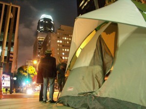Los Angeles, CA-Los Angeles residents have been laying siege to the Central City Association for nearly a month. The people have been dutifully operating within the law, pitching tents at 9 p.m. and breaking down camp by 6 a.m. right in front of the “1%’s” lobby here in Los Angeles. In the day, we occupy Pershing Square and outreach, rest, and build our community. The people involved have been arrested and harassed, and it is escalating each day we camp at the doorsteps of corporate power.