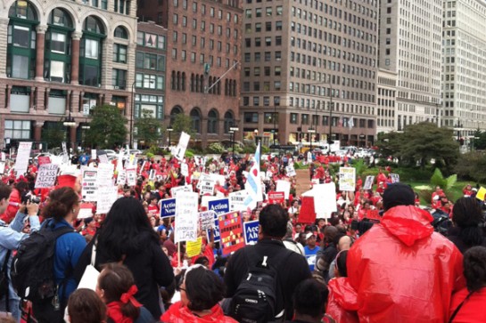 The march begins and soon we are on Michigan. “Get up, get down, Chicago is a Union town!” we chant over and over, raising our hands on the up and leaning forward on the down. Three helicopters hover in the distance. Bill and I intermingle our chanting with talk of movies, cooking, babies. We move through a number of old union songs. We sing “Solidarity forever.” We chant “Hey hey, ho ho, crowded classrooms got to go!” We yell, “Show me what Democracy looks like? This is what Democracy looks like!”