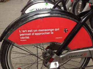 So I was struck today by the simple “social goodness” perpetrated by an anonymous crew of wheatpasters who seem to have done a second round of poetry posts to cover the corporate ads on the city rental “bixi” bikes. They proclaim that “BixiPoésie is the work of a group of . . . . students, workers, artists, activists . . . who dream of a world where art and culture flow freely in our streets. Where our minds are no longer stuck in the logic of might and economic reason. Where public space belongs to the citizens, rather than corporations” (http://bixipoesie.ca/). It is just one (albeit minor but telling) example of how the student and social strikers along with their allies are dreaming up strategies not to replicate the wreckage, which is kind of what Occupy feels like to me at the moment, or not to get “irresistibly propel[led] by “the storm” of the likely provincial elections “into the future to which [their] back is turned, while the pile of debris before [them] grows skyward.” Instead, there is an effort here to “awaken the dead, and make whole” by focusing on a relation between means and ends, which is another way of asserting a relation between form and content, versus what seems to have become a lopsided fixation on form as content in Occupy, eviscerated of an ethics — or social goodness. (Here’s one example from Occupy, where both the “choices” offered by this author are just different versions of contentlessness as well as a lack of imagination, especially if one actually hopes to grapple with the wreckage of history and fly intentionally toward a better future; http://truth-out.org/news/item/10358-occupy-national-gathering-electrical-storms-and-insurrectionary-corpses.)