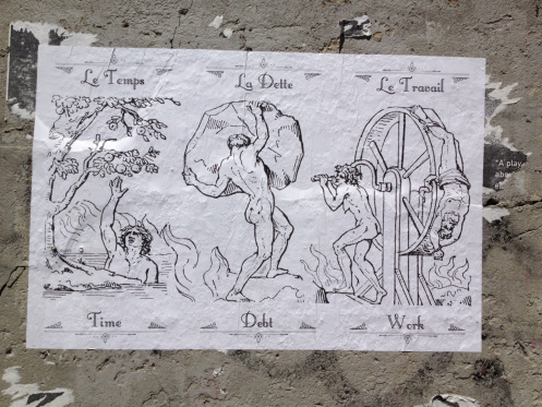 A few days later, I found another “EXIL” wheatpasted under a bridge, but this time it was in the same vicinity as another new Harpy piece, a triptych on austerity: “Time,” “Debt,” and “Work.”