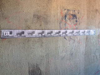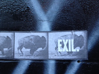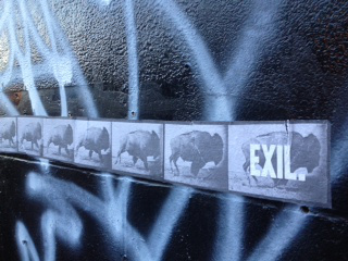 So last week in Montreal, when I ran across another piece of street art by Harpy, “EXIL,” I got to thinking a lot about home, history, and exile. Because like exile, Harpy’s work unsettles, as all good street art should at this unsettling moment (http://www.facebook.com/pages/Harpy/249684105126331/). Maybe this bison, a stopped-in-its-track still image from the stop-action series of photographs taken by Eadweard Muybridge (1830-1904) as well as a shorthand symbol for the exile and extermination of indigenous peoples of the Americas, like Benjamin’s angel of history, isn’t running away from something — a passive victim. Perhaps this bison in Harpy’s “EXIL” also has its face turned toward the past, toward the wreckage piling higher and higher, even as the winds of “progress” propel it with “such violence.” Or maybe it’s racing full-steam ahead (http://upload.wikimedia.org/wikipedia/commons/2/24/Muybridge_Buffalo_galloping.gif), propelling itself toward its own half-compulsory, half-self-imposed exile, from which to then linger, look backward in its own good time, and contemplate what it would mean to “make whole what has been smashed.”