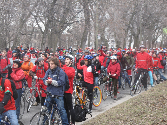 Who knows, soon cops may be rounding up the little kids who are joining in too? Like the 8- or 9-year-old girl on this bike ride today who kept starting up chants all by herself, calling out the first part, with all the adults around her then calling out the second part–such as in “Charest” “Whoo-Who!” You have to hear this chant to appreciate it, resonating with what I’m told is a hockey cheer/jeer, and never failing to elicit glee among the participants. The glee on this young cyclist’s face, though, put all the others to shame: her little act of self-organization was working! And like kids who’ve grown up in Zapatista autonomous communities in Chiapas or MST communities in Brazil, to name two, maybe this child–and so many children I’ve seen on the Montreal spring, outwitting police cars during their neighborhood casseroles in order to take the streets, or already on the streets in situations like last night’s eruptive disruption, or organizing walkouts from their high schools, or even meandering into Ryan’s music tonight–will grow up in such a radically different society that she’ll think self-organization along with practices of mutual aid and dignity, for starters, are the “natural” norms.