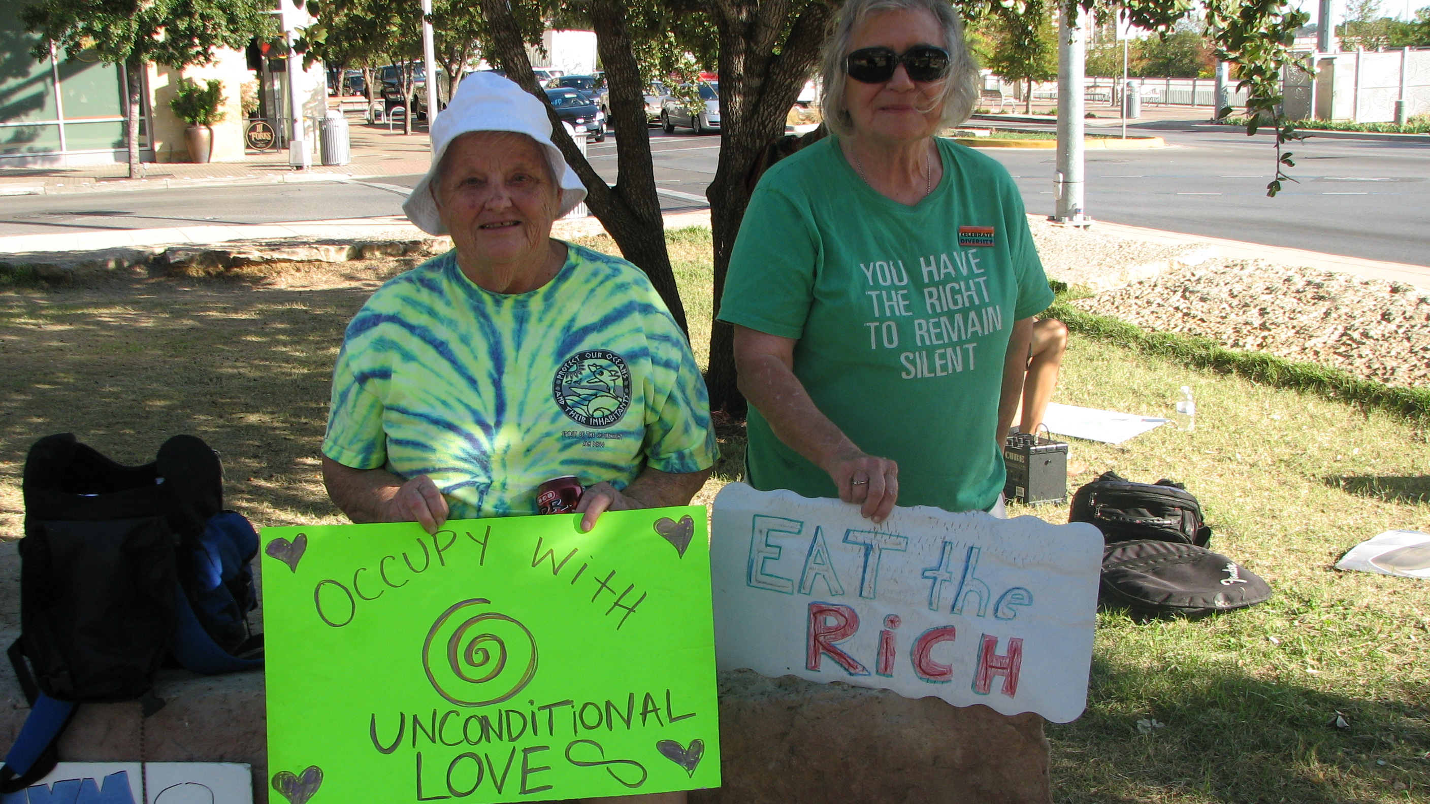 After I shook Sergio’s hand and began wandering about, I saw a couple of older women digging through the sign tent, where the used signs are stored. One pulled out a sign that said “Eat the Rich,” and the other decided on a tattered sign that said “Occupy with Unconditional Love.” They were headed for the honk if yer horny line, so I ran to catch up with them. We chatted for a moment in the shade of a live oak tree that arched over the edge of the plaza. Their names were Joyce and Jane. Jane was 72 and Joyce was 78 1/2. They told me they drove all the way from Bartlett, which is way out in the country about an hour north of Austin. Jane said she came to the protest before, because she believes everyone should have a chance to share in the wealth. She said they are going through rough times because of the drought as she has a farm and Joyce lives on a ranch. But they know many folks are having a tougher time of it right now, so they formed a non-profit organization called, “Food for Friends,” to help out. They started feeding just a handful of folks in their little area last year and now they feed over 120 people. They get donations by word of mouth. Jane said everything in our economy is lopsided and she is for occupying everywhere. She said the previous weekend she was in San Antonio to support Occupy San Antonio and Indigenous Day, which she hopes one day will replace Columbus Day. She says we are all suffering needlessly and all the money going to corporations for war and bailouts has prevented any positive social change.