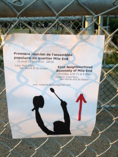 One Plus One: We’re now in week four of the Popular Assembly of the Mile-End Quarter, which meets every Thursday at 6:30 to usually 9:00 or even 9:30 p.m. at a “park” wedged between two near-highway urban streets — hence, the assembly promo always adds quotation marks to the location of “Clark Park.” The park is always bustling with dinner picnics and kids running from the “water park” fountains to the playground equipment. Cars, trucks, and motorcycles whiz by. It’s hard to hear under the best of circumstances, and like the anticapitalist assembly, the popular one necessitates whisper translation. Fortunately, it’s been not only me but three, four, or six others we need it. We huddle in a corner of the assembly circle, hardly able to hear the already-circumscribed version of the conversation (again, the “translators” are always whoever kindly volunteers and are always doing their best!). Most of us English-as-first-language folks don’t speak up, except those who can speak French but have a harder time understanding it, so need the whisper translation.