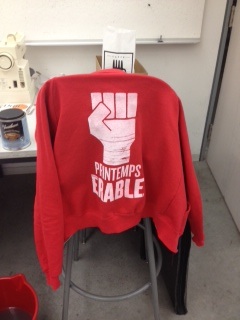 As yet another aside before I move into the last bit of depth, so far, on the deceptively simple “maple spring” phrase is this: Canada’s flag is made up of two colors: red and white. Many here are adding other squares of colors to the red squares, to signal particular political stances. For example, some add a blue square, referencing the blue of the Quebec provincial flag (i.e., sovereignty). Since special law 78 passed, many have added a blue square, signaling the end of a democracy society because the law basically criminalizes dissent, free speech, and free assembly. Anarchists turn their red and black into their own version of that combo: the end of statist politics. A white square often gets added to the red square to signal “pacificism.” No one has mentioned this to me, but after my real-life friend noted that tension of nationalism versus sovereignty, I started thinking about how the national red-white national flag’s color combination has been thwarted (or maybe not?) by the tiny red-white squares on people’s shirts here.