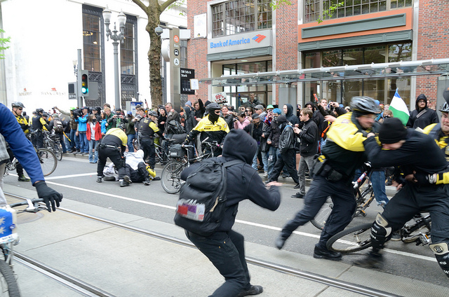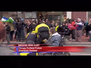 The cops dove into the crowd, grabbing protesters’ shirts, pants, legs, arms – whatever they could get their greasy paws on. Comrades were crushed by the gross weight of these beasts (and I’m not talking about horses). Because standing by and watching is how we got ourselves into this (much larger political mess), many reacted like they always do – with direct action! We grabbed our friends as they were tackled and pulled them back into safety and out of the grips of the Portland Industrial Police Complex. Based on the voraciousness of the attack, we wondered if there was some sort of dissent-crushing quota these pigs were trying to meet. We grabbed as many as we could, reassembled, and headed forward to the Jailhouse. The Disco Trike turned back. We couldn’t afford another $850 incident.