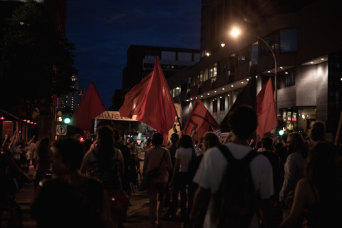So I’d (almost) forgotten how revolutionarily romantic it is to walk for five hours non-stop through a summertime Montreal evening with hundreds or thousands of fellow disobedients. Because as I realized last weekend, there’s nothing like a special occasion — consecutive illegal night 75 — to encourage the rebellious spirit & a big, festive, feisty evening demo, complete with enormous red flags (and lots of little ones too).