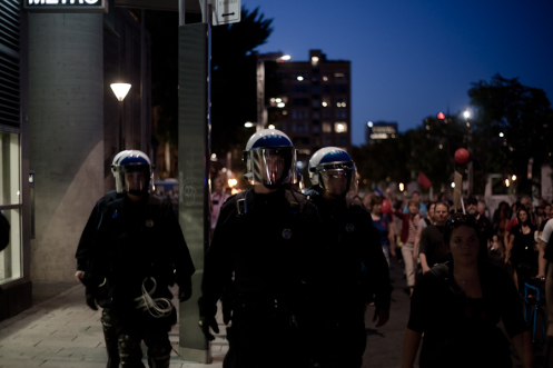Montreal, QC-It is probably to be expected, if one can “expect” anything in relation to novel social movements, that after some two and a half months of gathering at the same spot, at the same time nightly to take the streets without permission, thanks to and precisely in contestation of Quebec’s special law 78 criminalizing a variety of dissent, these nocturnal strolls would slow down. While the actual pace hasn’t mellowed much, the number of participants has certainly diminished. But even if there are just barely over the “magic” illegal number of forty-nine people on hand, and when there are even fewer, these marches go on, like clockwork. That fact alone makes them rather remarkable. There’s this notion that even if a lot of students are resting up after nearly five months of strike for the flash point of striking schools “starting” or likely not in August, and even if many other folks need breaks from night-after-night marches, the illegal demos are seen as a must — until victory. Still, of late it can be a dispiriting and often-annoying experience, given how few show up, and often who those few are.