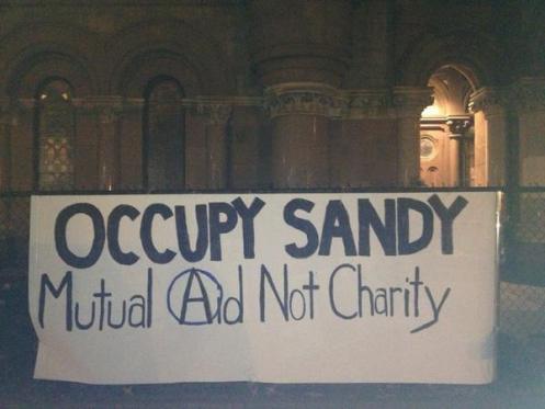 “Did you say you’re an archivist?” they asked distractedly, staring at their laptop screen. “No,” I replied, “I’m an anarchist.” I instantly got a big smile and high-five from my new acquaintance. “Cool! I’ve never heard of that archive. What is it?” When I explained it was an independent space filled with social movement cultural production more for us than preservation — cultural ephemera like zines, posters, films, books, stickers, banners, buttons, T-shirts, audiotapes, periodicals, and more — and that we did related events, they eagerly asked, “Do you have ACT UP materials, especially from Philly? ACT UP was amazing in Philly.” A minute later we discovered that we had both sublet the same apartment at different times in Philly at Fancy House, one of those anarchic collectively owned West Philly residences. “Can I hug you?” they beamed. Hugs are always good, especially since genuine ones, and I thought, what a lovely interconnected world we’re trying hard to create, by design and spontaneously, and how much even the most minor of mutual aid attempts leads, serendipitously, to reshaping social relations in micro ways. Macro ways, too, perhaps, as Occupy Sandy Relief seems to be doing. Again that sharp contrast: our cooperative, communitarian, egalitarian social relations against the cruel backdrop of the competitive, individualistic, imbalanced ones instilled by capitalism.