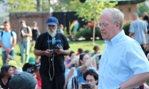 At 6:00pm, Chris Hedges addressed the crowd of Occupiers. Hedges described the state of political America, including the death of the radical class, the “monstrosity of faux liberals like Bill Clinton and Barack Obama,” and the marginalization of structural critique in political discourse. He addressed Occupy’s future, articulating Occupy’s immediate goal “to reverse the corporate coup d’état and put the power back in the hands of people.” Hedges opined that the black bloc’s tactics are destructive because it plays into the hands “of those who want to destroy us” by demonizing Occupy in the mind of the public. But he remained hopeful and urged patience, citing his experience in movements that took time to build: “This is the dress rehearsal for the end of the corporate state.”