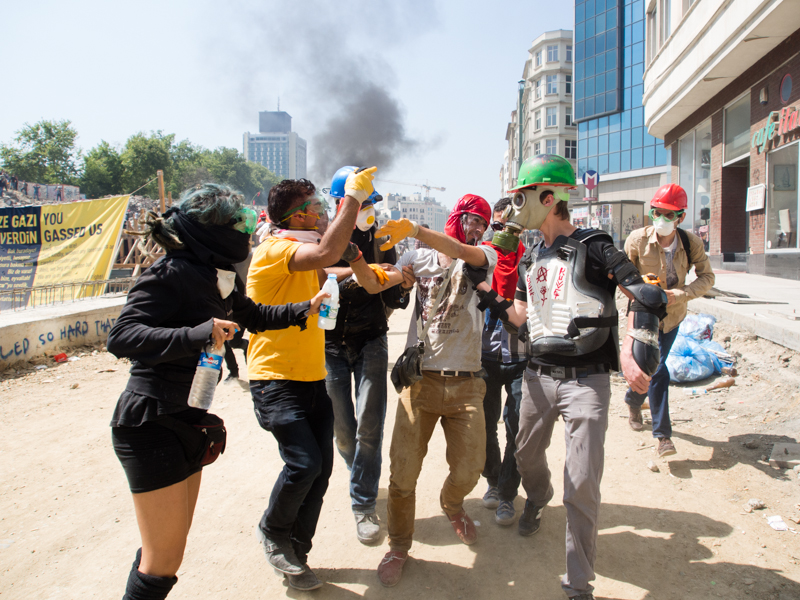 This image has been taken in Gazi, a Kurdish neighborhood where very often people are rioting against police. People of every age are there, from young boys to old men; women band together against the common enemy, the police. The protesters were happy to have so many journalists around. The general feeling was that those people were used to doing what they did: very organized with cars ready in case of injured people, a pharmacist with his shop open, wearing swimming goggles and a mask, ready to help out. In the meantime, very close to the spot, life goes on normally inside a bar and cafe. There is some concert in a bar and people are doing normal things, while others are fighting in the street–very unusual.