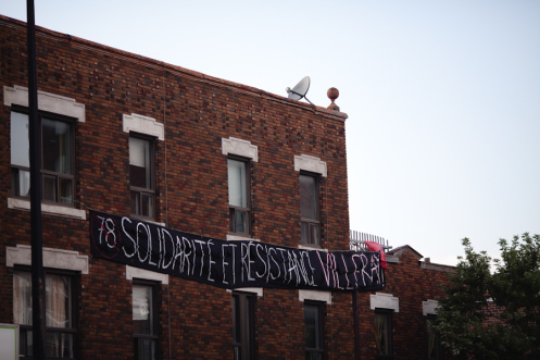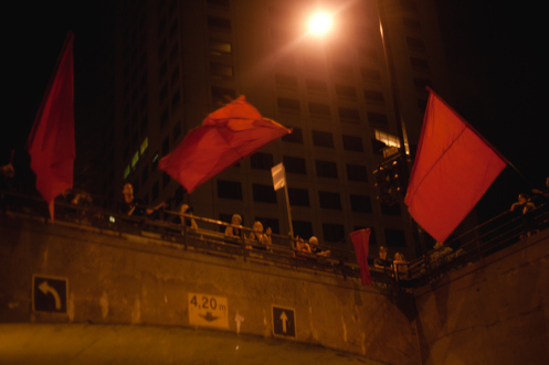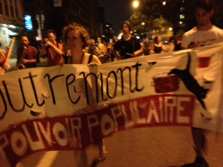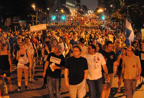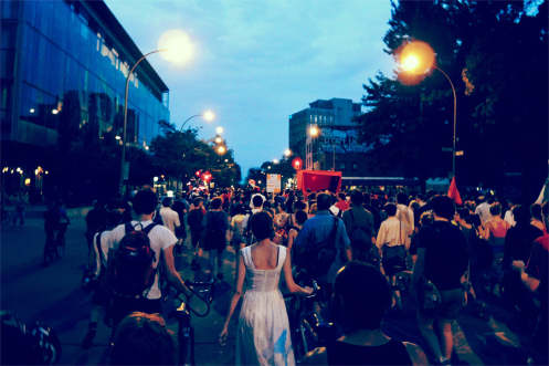 But the elections are already not playing well, at least not to the “audience” that poured unexpectedly by the thousands into the streets on this first illegal night march of August, turning the now-familiar “fuck law 78″ chant into a revised “fuck the elections.” As the majority student association CLASSE so well articulated in its manifesto, printed in the French-language paper Le Devoir the same day when rumors flew recently of Charest’s intent to call the elections, there is a grand divide right now between two worldviews — one represented by this night 100 versus day 1 of electoral campaigning: