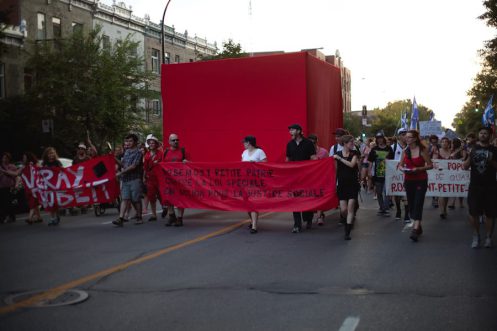 There was a huge contingent of drummers, all dressed in red, and it in turn was backed up by red-bedecked popular neighborhood assembly banners and an enormous three-dimensional fabric red square (on loan, I’m nearly certain, from the École de la Montagne Rouge [School of the Red Mountain] art collective — and the whole brilliant-red group was part of the ever-larger and also extremely red rolling wave of popular neighborhood assemblies and casseroles that started way north of downtown about two hours early and fused with each other as they met at multiple appointed intersections to then continue on together, ever larger and ever louder.