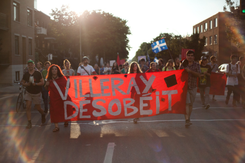 The assemblies could be bigger, and certainly more reflective of various population groups in Montreal — a problem not unique to the neighborhood assemblies, nor the student ones, nor those of Occupy (and on and on). As with other assembly experiments, those within them are aware of such shortcomings. And in this case, the assemblies seem to be particularly sensitive to two key things: first, they want their own autonomous identities, to grapple with the needs and issues of their parts of the city; and second, we’re all also under this pressure-cooker schedule of having to ramp up quickly in order to offer real aid to the striking schools, real soon. In Mile-End, for instance, we’ve been having 3-plus-hour assemblies once a week, along with 3-plus-hour weekly mobilization/social strike working group meetings (and other working groups, but that’s the one I’ve been going to), and our weekly evening orchestrole, a form of illegal demo, solidarity, celebration, and outreach. Oh, and they are also contending with the fact that in all likelihood, they too (like so much other dissent and organizing) are illegal in various ways under special law 78, and hence the sentiment of disobedience spelled out on the Villeray popular assembly banner:
