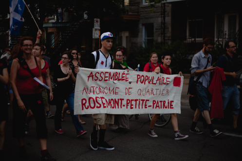 But night demo 100 signaled another huge shift, potentially pivotal as well in relation to the elections: there are now numerous popular assemblies, begun over the past couple months. They weren’t there at the start of this student strike, nor at the start of the illegal night marches. Now, in many corners of the city, they meet weekly or every other week to talk about issues related to and springing out of the student strike, and many include students, parents, and teachers alongside other neighbor-allies. They also discuss steps toward a social strike (even if in small symbolic steps for now) and tangible aid for the upsurge soon in the student strike. Furthermore, the assemblies all use various forms of direct democracy. They share and borrow that from each other. For instance, the Mile-End popular assembly that I attend asked facilitators from another neighborhood assembly to come and facilitate our first couple assemblies (which they did), and we sent emissaries, supporters, and helpers to a new assembly started in the neighborhood just next door to Mile-End last week, in Outremont. We also did outreach for their first assembly during our weekly “orchestrole” (casserole plus marching band) on the Wednesday before their assembly, detouring into their neighborhood a bit to hand out flyers — ’cause lots of people come out to listen to loud music rambling down the night streets!