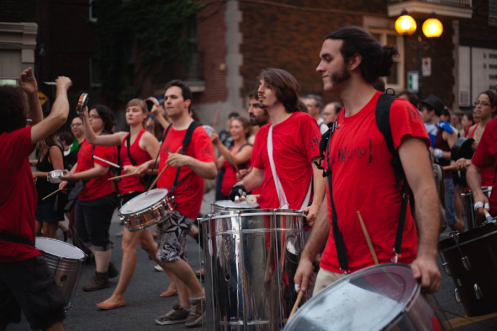 Last Wednesday night, a week before August 1, back in Mile-End, at the end of our orchestrolling as some of us stood around in an intersection chatting, with 3 cop cars vainly trying to get us to go home, we discussed trying to get our assembly and neighbors to walk downtown as orchestrole/casserole and meet up with other neighborhood assemblies at various convergence points along the way. Several assemblies had done this several weeks ago for a night demo, and it was lovely. We figured: let’s make a Facebook events page, do outreach via email to our various contacts with other assemblies, and hopefully the “casseroles march downtown” will happen again — since that’s pretty much all it took last time. Over the next few days and into early this past week, before August 1, suddenly it seemed that multiple assemblies had had the same idea, had also made Facebook event pages and even posters, and had also started doing outreach (there is no centralized popular assembly list, even a bottom-up version!). And absurdly enough, many of us had picked many different and conflicting convergence points, with no way to pull those puzzle pieces together. Organizational enthusiasm seemed to be creating mayhem, which sort of seemed a good problem to me in this case, since it at least emphasized the enthusiasm part. At our mobilization working group on July 30, we decided what the hell, it is too confusing. Let’s just meet up at our orchestrole spot at 7:00 p.m. on August 1, since people are used to that in our neighborhood, and then do our best to find other neighborhoods. Of course, we hadn’t actually mentioned this meeting point to anyone at that point, so we went home and started trying to spread the word around Mile-End.