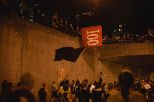 The enormity of night 100, when all was said and done, is that everyone recognized its enormity. That’s why the streets were filled, with people, politicians, media, and riot cops. That’s why so many indie photographers took so many gorgeous pictures, a few of which are here, and why CUTV livestream reporters seemed to be around every turn, chatting with as many people as they could cajole to talk on air. That’s why so many people walked miles from their neighborhoods and then kept going, kilometers more, with heavy banners and/or heavy instruments in tow. That in itself was the portrait of popular power: the populace showed up in droves, on foot and bikes and wheelchairs, or leaning out windows and balconies to wave — as always — as we marched by.