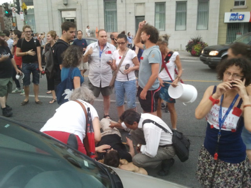 Suddenly, within a group of hundreds in our intersection, all dancing and prancing around, I saw the front of a car coming toward me, with adults, kids, and dogs (most of them my comrades from the Mile-End popular assembly) “bouncing” off the hood, nearly being crushed under tires and hit by other parts of the automobile. It seemed so surreal that someone would simply intentionally drive into hundreds of people that I could barely register it at first. It had that slow-motion sense alongside horror. I and others leaped to help, and many folks threw pots and pans at the hit-and-run driver as they sped away; people ran after the car to try to get the license plate. There were lots of shaken folks who’d been brushed or hit by the car, including a kid who got hit in the knee, and one person seriously hurt (pictured below). Someone called an ambulance, and folks formed a circle around the wounded person, trying as best they could to medic. About five minutes later (despite police obviously lurking on the edges of our casserole), paramedics arrived. When I look at this picture, in hindsight, I realize that half the faces of those doing the caretaking are my neighbors in Mile-End and my comrades in the assembly.