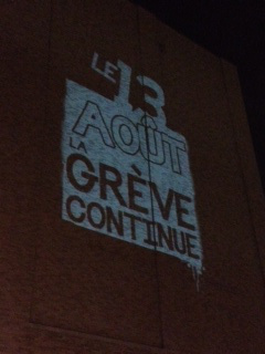 This grand battle was captured for all to see — writ large on night 100, like everything else — in the form of an enormous projection on a building wall, just as we thousands and thousands rounded a corner at a big intersection. Ahead in front of me, I could see people turning backward to face the part of the demo I was in, but instead of looking at us, I could see people looking upward, fingers pointing upward, eyes lighting up, illuminated by the illumination of Nous Sommes Tous Art. Click on this link to see it for yourself (http://youtu.be/CIgnVSkXWWs), but it involved a series of repeating words, including our street slogan “fuck the elections,” but also decrying phenomena like racism, capitalism, and neoliberalism, and contrasting representative democracy to self-management. Its grand finale was the logo/slogan that’s now appearing as wheatpasted poster and elsewhere around Montreal: “August 13. The Strike Continues.” Rather than agitprop or empty street art, though, this wall of words reflects the on-the-ground reality of what everyone is preparing for — to hold the strike — using the very processes that offer a working alternative to electoralism (whether people take 30 seconds to try to vote Charest out or not in the privacy of a voting booth, since clearly ousting Charest is widely popular within this Maple Spring, if only symbolically).