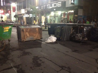 Yet all that wasn’t so unusual in the course of this long student strike. And in fact, much of the tension that riot cops usually create seemed neutralized, precisely because people have now lived through it and gotten used to it. As many people commented, nearly everyone on the street displayed a remarkable lack of fear around the police, replaced by a militancy in the sense of not backing down. That meant different things for different people, including the police, who often ignored things like a bank window being broken (apparently a coop bank, so everyone in the vicinity laughed “Why not a real bank?” as some random guy calmly used the ATM next to the smashed window, causing the second amused & proud comment from the illegal night marchers: “Only in Montreal!”), and when the police encountered a dumpster barricade at one point, the ones on horses trotted through to follow the enormous demo from behind, but the cop cars behind the horses simply turned around and went a different way, leaving the dumpsters to hang out on their own on a now-quieted formerly busy street — with both disobedients and police gone.