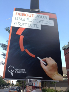 Most momentous, though, was the accidental line in the sand of this 5.5-month Quebec student strike: night 100 of the illegal manifestations and Premier Jean Charest setting the election date — September 4 — starting on August 1 too. For my non-Canadian friends, within certain parameters, elections are called by the party in power, and that can be used as a political chip in their favor if played well. Once called, candidates have five weeks to go all-out with promotion, and at the stroke of midnight as July 30 turned to August 1, I saw Québec solidaire (QS), a social-democratic and sovereigntist political party that includes candidate Amir Khadir, who got arrested this past June in a casserole while protesting special law 78, already busy putting up posters, including ones highlighting that QS stands for “free education.”