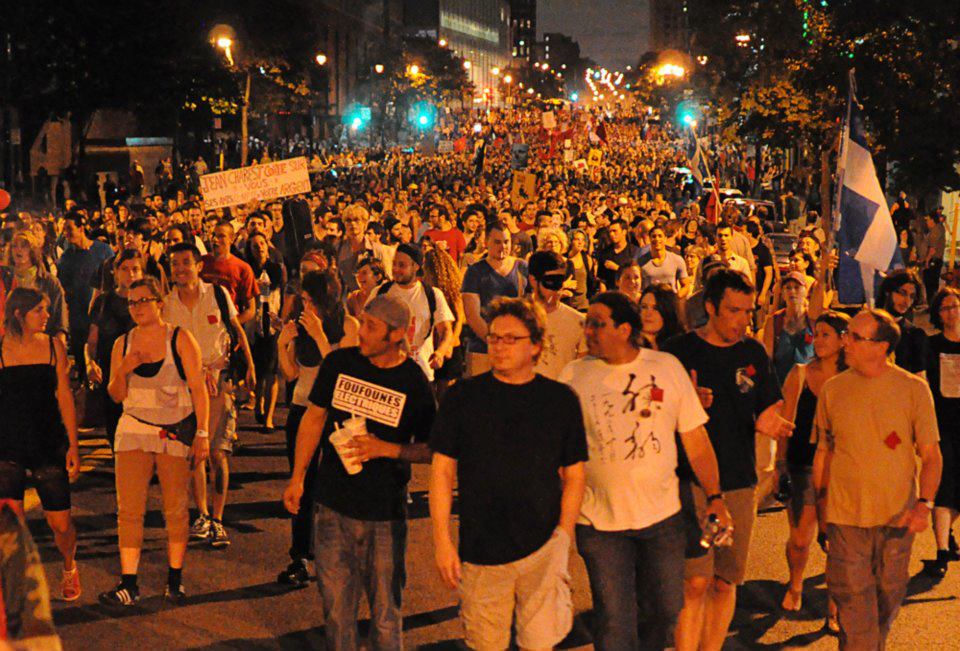 “The way we see it, direct democracy should be experienced, every moment of every day. Our own voices ought to be heard in assemblies in schools, at work, in our neighborhoods. Our concept of democracy places the people in permanent charge of politics, and by ‘the people,’ we mean those of us at the base of the pyramid — the foundation of political legitimacy. . . . Each time we take to the streets and set up picket lines, it is this kind of democracy that at last breathes free. . . . Democracy, as viewed by the other side, is tagged as ‘representative’ — and we wonder just what it represents. While elections come and go, decisions remain unchanged, serving the same interests: those of leaders who prefer the murmurs of lobbyists to the clanging of pots and pans. Each time the people raises its voice in discontent, on comes the answer: emergency laws, with riot sticks, pepper spray, tear gas. When the elite feels threatened, no principle is sacred, not even those principles they preach: for them, democracy works only when we, the people keep our mouths shut.” (http://linchpin.ca/English/Share-Our-Future-%E2%80%93-CLASSE-Manifesto)
