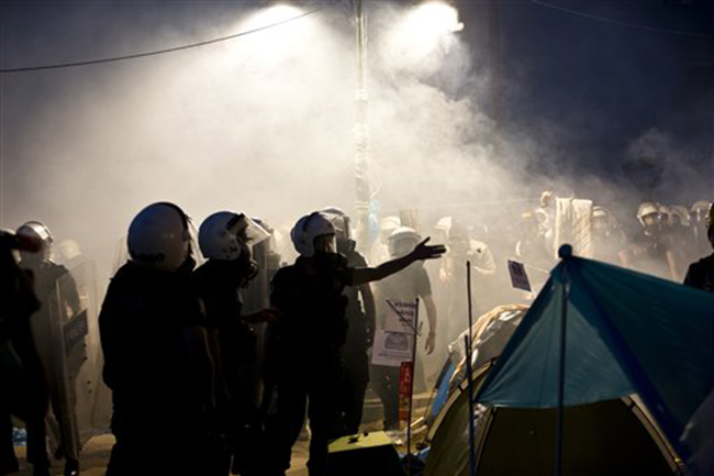 That’s when the gas canisters appeared, without any warning, like comets in the sky. I saw the white cloud afar on the other side of the square; I saw some commotion. But by now, we, the protestors of Turkey, are very much familiar with this particular sight and sound, tear gas canisters being fired – so I didn’t start moving immediately. See, it is not too bad if there is only one and the wind is blowing the other way. But people were moving, in fact, running. Unlike the streets on which I have been teargassed before, here, on the square, the effect was like a stone thrown into water – ripples of people – moving, fast; which in and of itself is very scary when you are in the middle of it. I did what I learned to do last week: I shouted with my hands in the air, “do not run, remain calm,” stepping back slowly, while trying to do what I preach; that is, remain calm. I looked around only to realize that I was already separated from my friends… I tried to shout at them “don’t move too fast, lets see what is going on” but it was too loud, and they were already far. In my mind I was going “maybe the shooting will stop, maybe it is not too bad, no need to run” when a gas canister landed next to my feet. I stepped back, looked up and saw, well, a shower of gas canisters landing left and right. As I started stepping back faster and faster, one landed in front of me, one to my left; I turned to run and another landed in my way… Turns out that I was mistaken; I was the naive one to think that the police would not attack a city square full of peaceful people; not after the governor has announced that they were not planning to attack. Really, how stupid am I to trust what the governor says at this point? We were under what looks like a tear-gas storm.