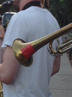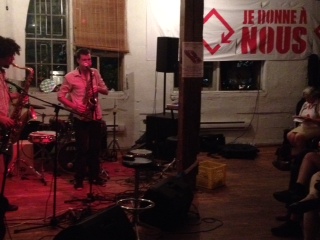 Tonight’s sounds of the red square displayed a preview of this togetherness. It included the music of resistance, from jazz to the first-ever indoor orchestrole (with loaner cookware on hand, so others could join in, loudly and boisterously) to hip-hop to protest chant in between, amid a room full of red squares and rabble-rousers. Despite the forecast of rain, it turned out to be a lovely evening here in Montreal to raise legal funds for the Quebec striking students. Those funds are signaled by another graphic play on the red square in the logo of the legal helpers je donne à nous, a group that’s still gladly taking contributions for the coming storm of riot police and, as rumor has it, actual implementation of special law 78 when school soon starts/doesn’t start come August 13 onward.