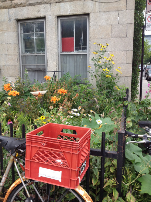 And likewise, so much of this radical subversion is being read through the tiny little red square. Sometimes, like in the photo below from much earlier today, taken on my walk to the UQAM strike council, all the eye thinks it sees is the pleasurable aesthetic of intended square converging with an accidental one, or the randomly lovely visual of this symbol in all sorts of places and spaces across the urban landscape, so quiet now during the two-week summer holiday that hits Montreal at the end of July. (In fact, there’s basically a voluntary “social strike” of sorts already going on, since many businesses simply close altogether for these two weeks and go on holiday too — making it maybe a little easier for folks to perhaps imagine what a social strike would look or feel like: leisurely noncompulsion, for starters, so as to do what one wants instead.)
