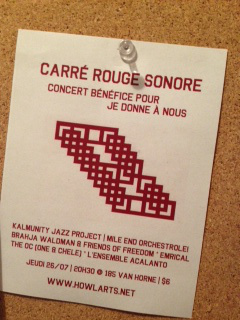 For example, the École de la Montagne Rouge crew, made up of still-striking students who are still making posters and other brilliant (and often brilliant red) visuals for asocial movement instead of sitting quietly in rows of chairs in a classroom, brought their own collective envisioning of red squares to this musical fund-raiser by designing the logo (http://www.flickr.com/photos/stefanchristoff/7625011812/).