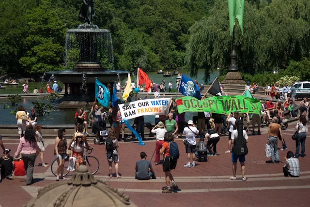 On our small march, some of us carried maracas, some had flags, bright blue balloons to symbolize drops of water, and most of us carried flyers to pass out to spectators that we passed. The people at Central Park were very receptive; they were overall happy to take our flyers that explained the dangers of hydro-fracking, and those riding by on their bikes often raised their hands in support as we passed. We received the best response from the group of skaters close to where we began, who roared in unison when someone called out “Occupy Wall Street loves skaters! Join us!” While we wanted to both spread awareness and get people to join in on the march, we were unable to pick up new participants. There was also a very minimal police presence; I only saw some park rangers, and there was no conflict whatsoever with authorities.