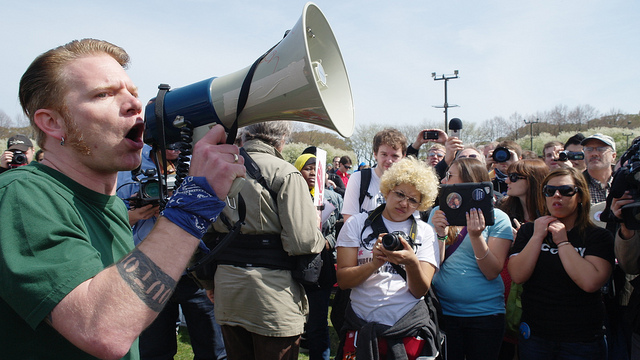 Once the march arrived in Butler Park, the energy was palpable. Some of the crowd focused around a rousing soapbox session, backdropped by an American flag.