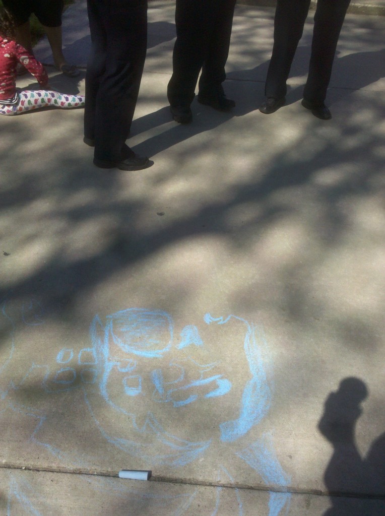 Three pairs of CPD legs stand by near a chalk drawing in progress. (Photo: Joe Macaré)