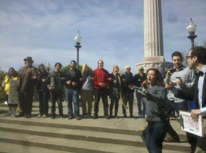 The first indication that the day would be a success began, for me, in Logan Square, where Occupy the Northwest Side held an “Occupy the Eagle” action in front of the monument of that name. Local residents brought and accepted donations at a Give/Receive Circle, speeches included an impassioned and affecting call for solidarity from a representative of the Chicago Teachers Union, a mock auction sold off “the historic symbols of Logan Square and the Chicago Northwest side” to the highest bidders, and volunteers from a crowd of 50-60 people joined in an eviction blockade rehearsal/training.