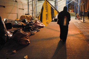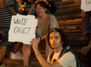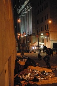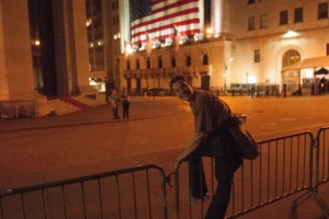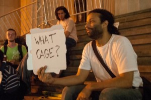 New York, NY-Sometime in April of 2012, shortly after occupiers started their “sleepful protest” of bedding down on or near the doorstep of the New York Stock exchange, the Freedom Cage was born: After Occupy was denied the reoccupation of Zuccotti Park, and a brief refuge in Union Square, NYPD had tolerated sidewalk sleepers outside the stock exchange building for about a week, during which I spent a few nights staying up and talking with the night-watch group that was in charge of making sure that sleepers remained undisturbed. We mostly sat awake on the sidewalk or on the steps of Federal Hall, from where we had a good overview of comings and goings in any direction, talking in quiet conversation to not disturb the sleepers. There was no drumming or excessive shouting. The entire atmosphere was calm and rather beautiful.