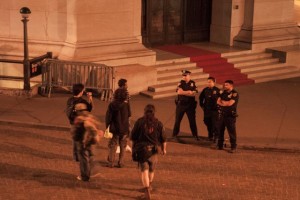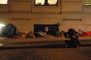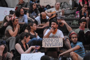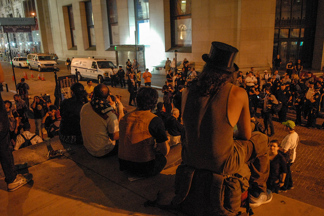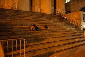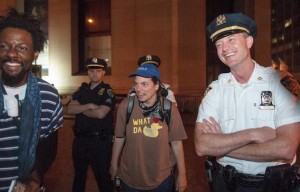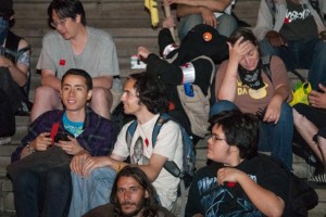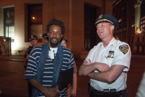 And lest we forget our not-so-peaceful encounters with the shirts of white and blue, Eric appeared and told us what he had just been through. The night before he had suffered a seizure while walking down the street, and as he came to he noticed two cops beating him up and placing him under arrest for lying in the street. He tried to stand up and walk away but was thrown down again, tried to stand up again, and was yet again thrown to the ground. Bleeding, he was taken to the hospital where it was confirmed that he had indeed had a seizure, and after he was administered five staples into the back of his head (sans sedative or pain-killer, mind you), he was unceremoniously dismissed both from hospital and arrest. He is currently looking for legal representation …