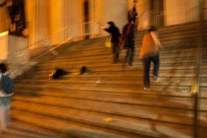 The first night I was there, we had one single NYPD officer standing guard on the corner of Wall Street and Broad Street. By Friday, the police contingent had grown somewhat, but nothing to indicate major concern from either side over the situation. In the early mornings protesters would usually get harassed with street cleaning teams washing the sidewalks, repeatedly (in general it seemed that the City of New York was developing a sudden urge to clean any place occupiers tried to call home, even if those places had not been cleaned for years beforehand) but otherwise they were pretty much left alone. By week’s end maybe 50-100 people were peacefully sleeping in small groups within steps of the world’s global financial center, when patience of the 1% and local residents must have run out, and cops started to randomly and rather brutally arrest occupiers on the morning of April 16th at 6 am for blocking the administration of government affairs and sitting on sidewalks. The rest of the protesters fled onto the steps of Federal Hall, a building which is under jurisdiction of the US Parks Department, and not the NYPD, and decided to settle there. By nightfall, a large crowd of 100+ protesters congregated on the steps, making music, talking, shouting and reliving the experience of the past few weeks.