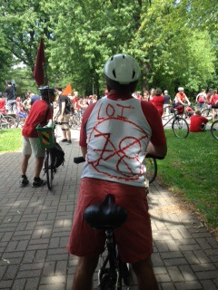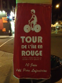 Earlier in the day, on my “day off,” I’d rented one of Montreal’s Bixi bikes so that I could join the “tour de l’ile en rouge” (tour of the island in red), which began from the same Parc LaFontaine where Occupy Montreal was having its assembly in another corner.