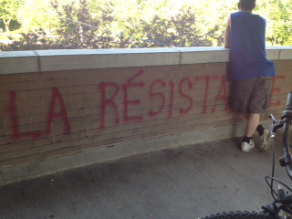 On Ryan’s last night here on this weekend visit, he played to an even smaller Occupy crowd in this park as the warm sunshine of today mellowed into the gentle warmth of a summer evening; half his audience was me, three of his friends, and a new friend I’ve made on the streets of Montreal, plus two stray kids who wandered over and a dog that ran over with a ball in its mouth. But a couple of the folks there, including my new friend, were at that open-to-a-world-of-new-ideas point in their lives, as they were newly working to help make that new world through Occupy (here and, for my new friend, in the United States). So Ryan played to them–songs of rebellion, resistance, disobedience, and hope. He also, inadvertently, played to me with his final song–about how the police kept coming at people, time and again, and the people don’t back down. Here I was, sitting in a thoroughly lovely park, with charming graffiti on a nearby park cafe proclaiming “La Resistance,” and only about 24 hours earlier, he and I had been part of the police coming at people and people not backing down. For really real, in a way that Ryan’s video simply can’t capture. Yet in a way that the chorus to Ryan’s last song this evening eerily grasped for me: