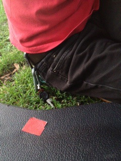 “What is this? Were you supposed to include the red square in your work?” I asked him, noticing a red square pinned to his shirt.