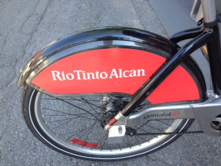 Even my rental bike became part of the surreal quality of this historical moment in Montreal, in yet another display of how imagery, symbols, and art are equal yet complementary partners in this uprising. All of the bixi bikes have advertising on them. (At one point a while ago, some anonymous culture-jammers printed up some 11,000 stickers with a few dozen or more different versions of short poems on them, and in a couple hours, covered over all the bixi ads with them [on 5,500 bikes.] They then put out a Web site that looked legit, claiming that bixi had decided to abandon the ads for the social good of beautiful words instead. When the prank was discovered, the Montreal bixi bureaucracy decried the vandalism and started ripping off all the poems. There was a near-riot, metaphorically, among the populace, which wanted those poems on those bixis, damn it! But I digress…as usual in this evening’s meandering blog.) My random choice of a bixi had this (red!) ad for RioTintoAlcan, which describes as “a world leader in finding, mining, and processing the earth’s mineral resources,” on its side and front: